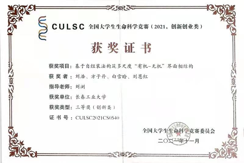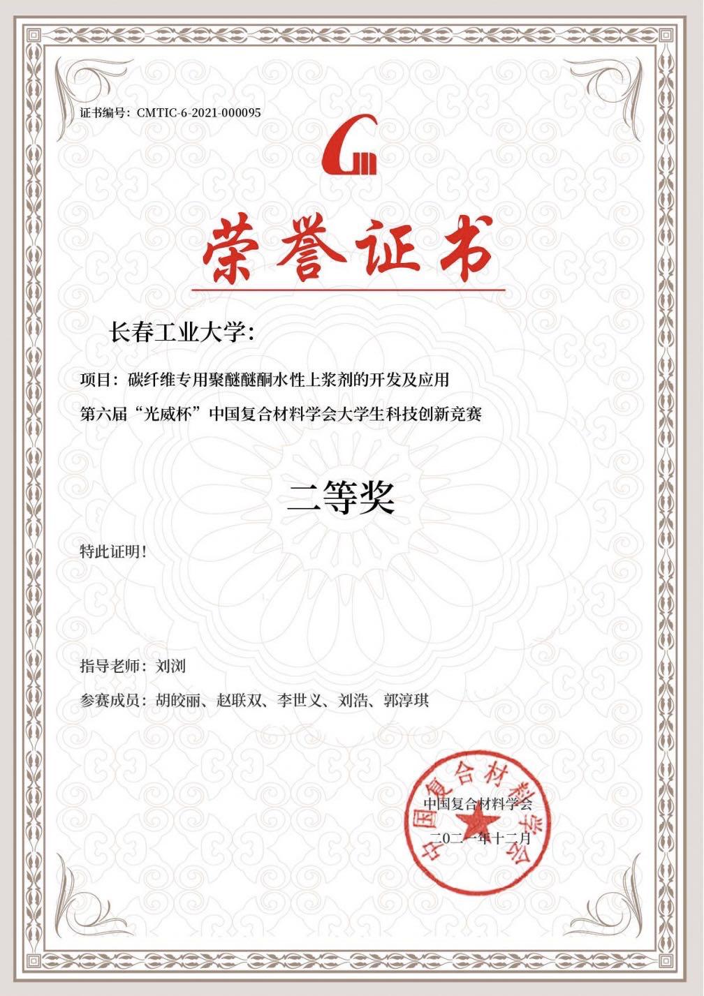 “天道酬勤”是沉淀在科技工作者基因血脉里的朴素信仰。在一个个平凡的日出日落间,一幕幕平常的实验场景中,大家都能看到刘浩同志的身影。作为一名理工类专业学生,她怀揣科技报国的理想追求。科研方面,在老师的指导下,该同志在本科期间就积极参与教师课题组科研项目,参与省级科创项目两项,以合著者身份在国际复合材料领域顶级期刊《Composites Science and Technology》(IF:9.1)上发表Construction of hierarchical “organic-inorganic” structure by self-assembly to enhance the interfacial properties of epoxy composites论文;在《Composites Part-B》(IF:13.1)上发表Water-based PEKC-COOH sizing agent for enhancing the interfacial adhesion of carbon fiber/polyether-ether-ketone composites论文。以项目负责人身份完成2021年度长春工业大学大学生创新创业训练项目:水性聚芳醚酮上浆剂对CF/PEEK复合材料界面性能的影响,并荣获优秀结题项目。