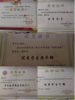 在校期间,曾获得2次国家励志奖学金,9次学业奖学金,3次单科状元;获得2020年度“长春市优秀共青团员”称号、长春工业大学第二十二届“十佳自立自强大学生”、获得校第十六期青马班培训“优秀学员”、校“文明大学生”荣誉称号、校“优秀团干部”、校“优秀团员”,院“优秀学生干部”“学风建设突出贡献个人”等。在学院内开展学习经验分享会,分享学习心得,考研心得,帮助学弟学妹们复习方向及方法,激发同学们学习的热情。