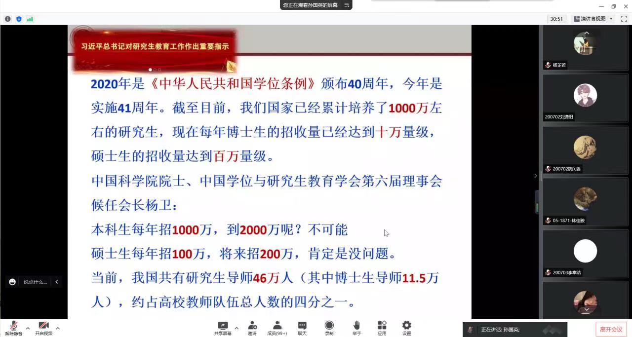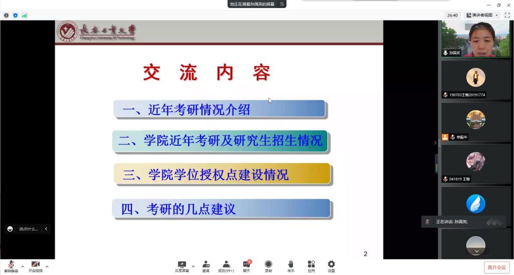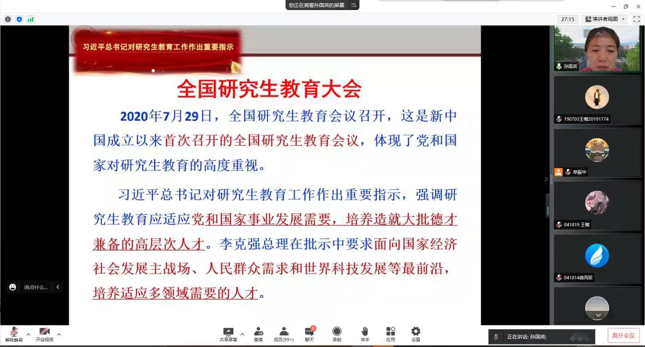 新闻网讯(通讯员:马静)为加强学生对考研知识和经验的了解,营造积极向上的学风,激发学生考研热情,6月17日,威廉希尔官网召开线上考研说明会暨优秀学子经验分享会,会议由学院副院长孙国英主讲,辅导员侯天放主持会议。2018级考研优秀学生代表进行了经验分享,2019级、2020级全体同学参加了会议。