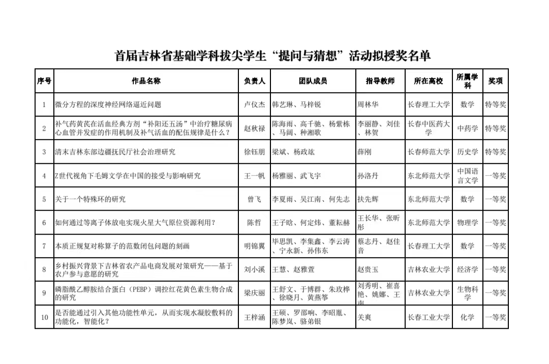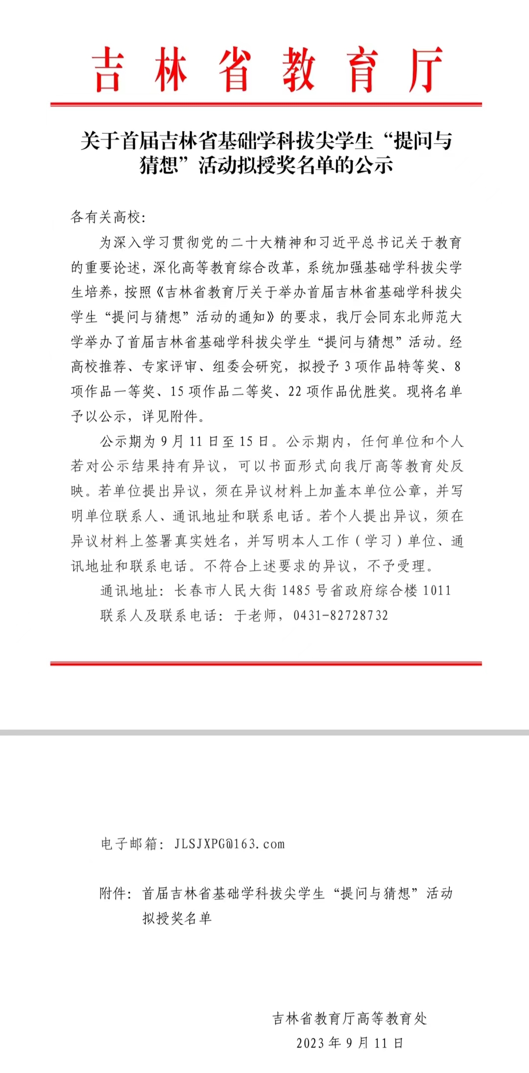 喜报:威廉希尔官网学生在吉林省基础学科拔尖学生“提问与猜想”活动中取得佳绩