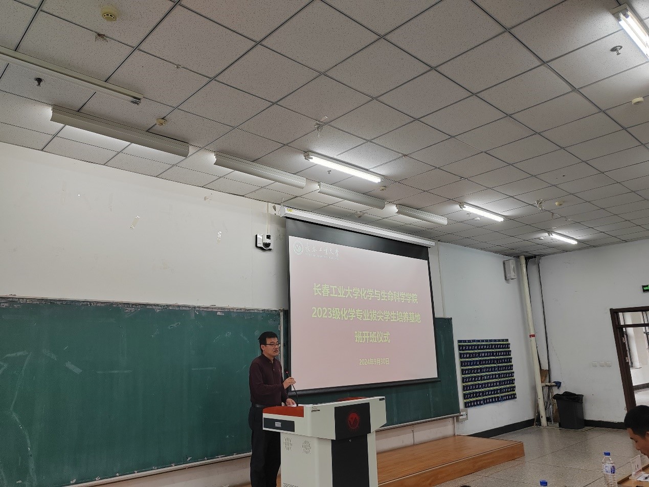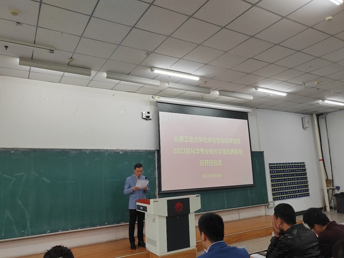 为加快学院化学专业学科建设及人才培养目标,对入选2023级化学专业拔尖学生培养基地班的优秀学生进行学业表彰,促进2024级新生学风建设,威廉希尔官网于2024年9月30日中午12:20在北湖西区西阶302教室举行威廉希尔官网2023级化学专业拔尖学生培养基地班的开班仪式,学院党委书记朱兴国、院长王哲、党委副书记郑岩、副院长王志兵、副院长刘宇、副院长肖凌寒、化学系党支部书记王宇超、化学系主任关爽,以及基地班全体导师和2023级、2024级辅导员老师出席大会,全体2024级本科生参会,开班仪式由学院党委副书记郑岩主持。