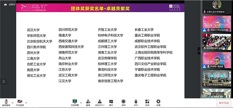 新闻网讯(通讯员 刘桂华)11月26日,第十届未来设计师·全国高校数字艺术设计大赛(NCDA大赛)总结会暨第十一届未来设计师•全国高校数字艺术设计大赛赛事发布会在线上成功举办。学校作为吉林赛区承办高校参会,再次获得国赛团体奖最高荣誉“卓越贡献奖”,并获国家级一、二、三等奖共16项,2人获全国优秀组织教师,4人获全国优秀指导教师。学校获评“全国高校设计赋能乡村振兴志愿服务先进单位”。