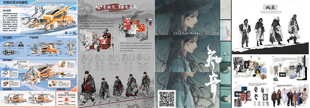 国赛一等奖获奖作品展示(从左往右依次为  工业产品设计类作品:《切割式采冰运输机》创作:刘宸汛 指导教师:何丽鹏;时尚设计类作品:《心有猛虎,细嗅蔷薇》创作:王彤彤,韩欣桐 指导教师:葛英颖;动画与视频设计类作品:《知音》 创作:李心心 指导教师:刘桂华;时尚设计类作品:《破茧》创作:周子涵 指导教师:兰天)